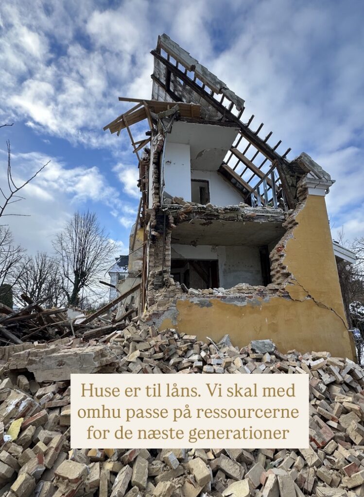 Nu kommer endnu en gigantisk nybygget hvid betonvilla – hvis kulsorte CO2-forbrug aldrig nogensinde kan udlignes. Mursten køres – har jeg fået oplysninger om – til genanvendelse i Svendborg. Alle andre materialer sendes ikke til genbrug. Vi ser et mix af: Køleskabe, pejs, bjælker, badeværelser, køkken, gulve, tagsten, toiletter, træer. Alt smadres!